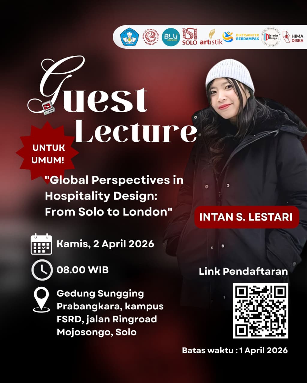 HUMAS, — Program Studi Desain Interior Fakultas Seni Rupa dan Desain (FSRD) ISI Solo menyelenggarakan kuliah Dosen Tamu dengan tema “Global Perspectives in Hospitality Design: From Solo to London”. Acara tersebut dalam rangka membekali mahasiswa dengan wawasan desain hospitality standar internasional dan memotivasi pengembangan karier di kancah internasional. Sub-tema “Menembus Batas Karier Internasional dan Tren Desain Hospitality Global,” acara ini dijadwalkan berlangsung pada Kamis, 2 April 2026, pukul 08.00 WIB bertempat di Gedung Sungging Prabangkara, Kampus FSRD, jalan Ringroad Mojongsongo.