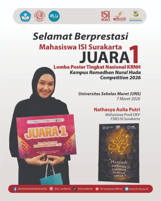 HUMAS, –Nathasya Aulia Putri, Mahasiswa DKV ISI Solo menjadi Juara I pada ajang Lomba Poster Tingkat Nasional KRNH (Kampus Ramadhan Nurul Huda) Competition 2026 yang diselenggarakan pada 24 Januari-7 Maret di Universitas Sebelas Maret (UNS). Event mahasiswa dan pelajar tingkat nasional yang bertajuk KRNH (Kampus Ramadhan Nurul Huda) Competition 2026 yang diselenggarakan oleh Masjid Nurul…