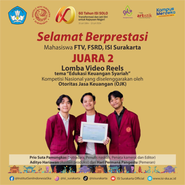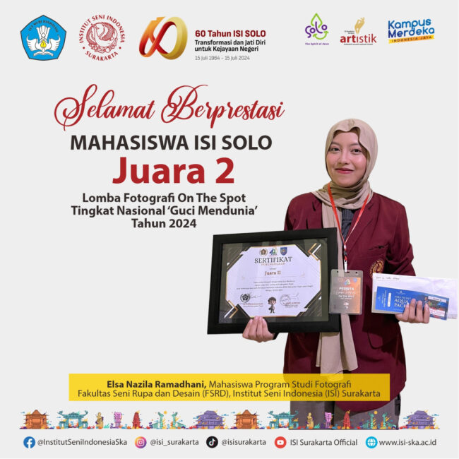 Mahasiswa Program Studi Fotografi Institut Seni Indonesia (ISI) Surakarta, Elsa Nazila Ramadhani berhasil meraih Juara 2 dalam Lomba Fotografi tingkat Nasional yang digelar oleh Persatuan Wartawan Indonesia (PWI) dan Dinas Kepemudaan, Olahraga, dan Pariwisata (Disporapar) dalam rangka memperingati Hari Jadi ke-423 Kabupaten Tegal, Provinsi Jawa Tengah. Lomba ini diikuti oleh 58 peserta. Selain dari kota…