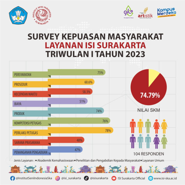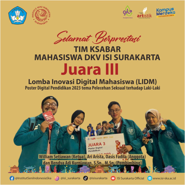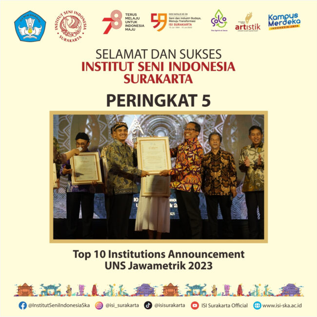 HUMASISISKA-Direktorat Jenderal Pendidikan Tinggi, Riset dan Teknologi (Ditjen Diktiristek) memberikan perhargaan kepada perguruan tinggi negeri (PTN) atas capaian 8 indikator kinerja utama (IKU) dan pembangunan zona integritas (ZI) menuju Wilayah Bebas dari Korupsi (WBK) tahun 2022. ISI Surakarta mendapatkan penghargaan dalam kategori IKU (Indikator Kinerja Utama) 6 yaitu meningkatnya kualitas kurikulum dan pembelajaran serta persentase…