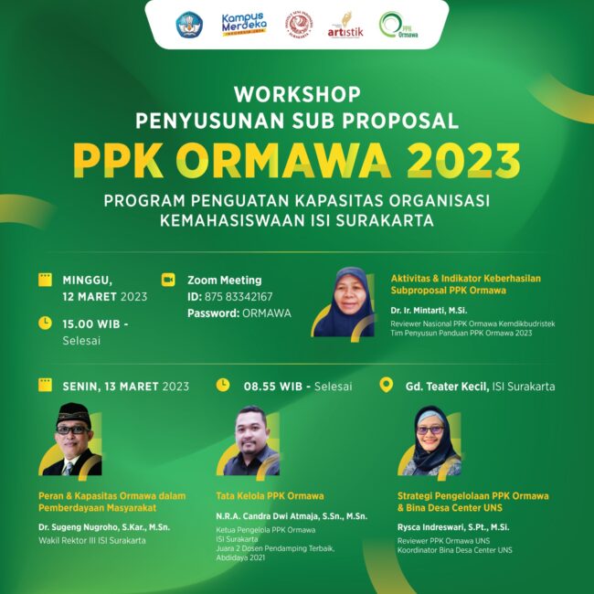 Guna meningkatkan kinerja perguruan tinggi dalam memperkuat kapasitas organisasi kemahasiswaan (ormawa), Institut Seni Indonesia Surakarta akan menggelar Workshop Penyusunan Sub Proposal Program Penguatan Kapasitas (PPK) Ormawa tahun 2023, Minggu-Senin (12-13/3) bertempat di Gedung Teater Kecil ISI Surakarta mulai pukul 08.55 WIB. Kegiatan workshop ini akan dilaksanakan secara daring dan luring dengan menghadirkan narasumber yang kompeten…