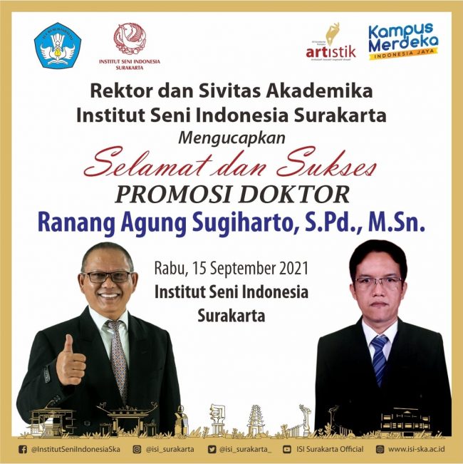 Rektor dan Sivitas Akademika ISI Surakarta Mengucapkan “Selamat dan Sukses atas Ujian Promosi Gelar Doktor” kepada Aries Budi Marwanto, S. Sn., M. Sn yang dilaksanakan pada hari Rabu, 20 September 2021. Semoga dapat mengamalkan ilmu pengetahuannya untuk kemajuan ISI Surakarta, Nusa dan Bangsa.