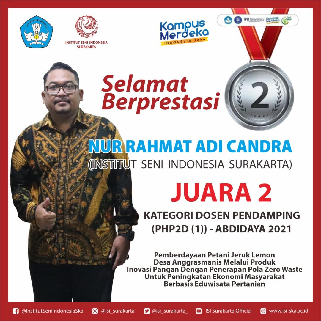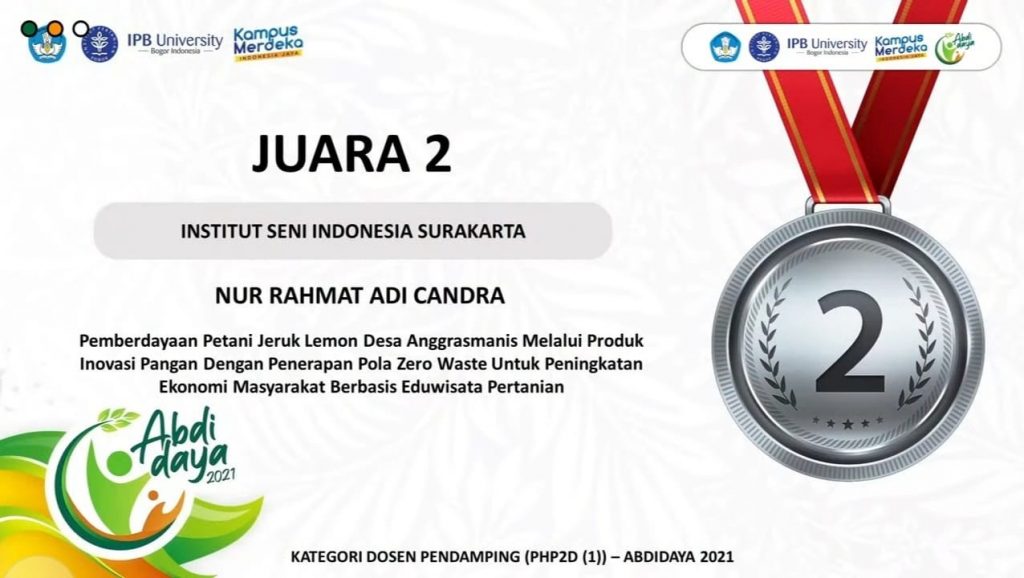 Pada kesempatan Abdidaya edisi pertama tahun ini ISI Surakarta berhasil melolosakan 3 Nominator yaitu 1 Nominator kategori Dosen Pendamping Program Pengembangan Pemberdayaan Desa (P3D) atas nama Muhammad Salim, S.Sn., M.Sn, 1 Nominator kategori Dosen Pendamping Program Holistik Pembinaan dan Pemberdayaan Desa (PHP2D) atas nama Nur Rahmat Ardi Candra D.A., S.Sn., M.Sn. dan1 Nominator kategori Mitra Desa P3D.