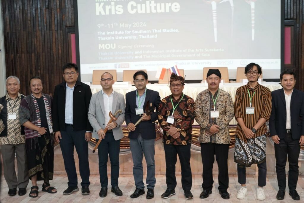 Program Studi Keris, Institut Seni Indonesia Surakarta (ISI SOLO) melakukan penandatanganan MoU bersama Thaksin University Songkhla Thailand pada Kamis 9 Mei 2024 di Gedung Museum Institute for Southern Thai Studies. Penandatangan kerjasama dilakukan secara seremonial antara Rektor ISI SOLO Dr. I Nyoman Sukerna,S.Kar., M.Hum., dengan President of Thaksin University Mr. Nathapong Chitniratna. Penandatanganan perjanjian Kerjasama ini disaksikan langsung oleh Konsulat Republik Indonesia di Songkhla Mr. Suargana Pringganu. Selain itu hadir pula perwakilan dari Program Studi Keris ISI Surakarta Bening Tri Suwasono, S.Sn., M.Sn. dan Basuki Teguh Yuwono S.Sn., M.Sn, serta perwakilan dari Sekretariat Nasional Perkerisan Indonesia bidang Kerjasama luar negeri Dr. Drs. Widodo Aribowo M.Sos.