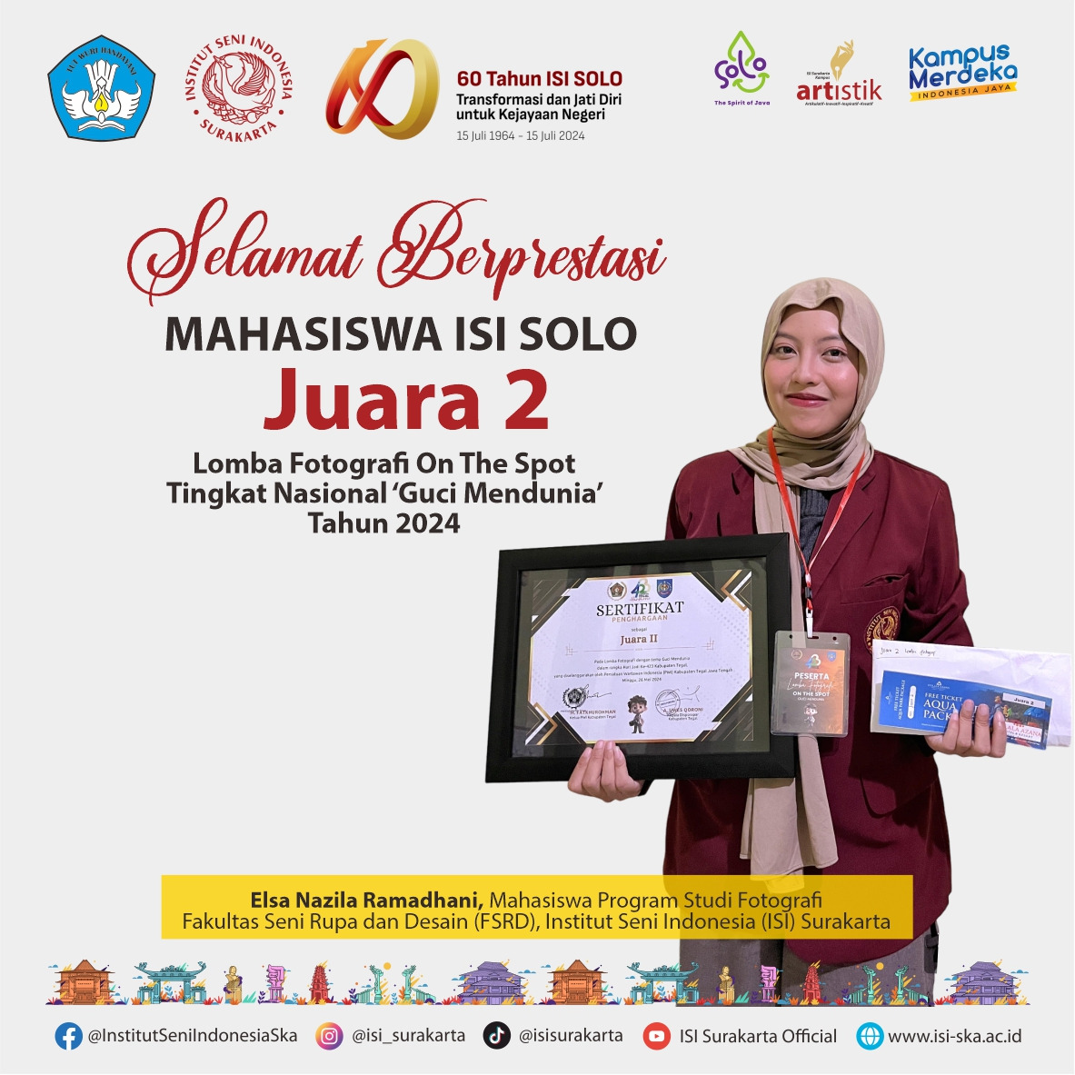 Mahasiswa Program Studi Fotografi Institut Seni Indonesia (ISI) Surakarta, Elsa Nazila Ramadhani berhasil meraih Juara 2 dalam Lomba Fotografi tingkat Nasional yang digelar oleh Persatuan Wartawan Indonesia (PWI) dan Dinas Kepemudaan, Olahraga, dan Pariwisata (Disporapar) dalam rangka memperingati Hari Jadi ke-423 Kabupaten Tegal, Provinsi Jawa Tengah. Lomba ini diikuti oleh 58 peserta. Selain dari kota Tegal, hadir para peserta lain yang berasal dari kota seperti Semarang, Bandung, Salatiga, Pekalongan dan lainnya. Ada enam spot foto yang sudah ditentukan panitia diantaranya: Gulala Azana Resort, Rindu Alam, Guci Forest, Pancuran 13, Salma Guci Resort, dan Golden Park. Lomba ini bertemakan, “Guci Mendunia” dan telah terselenggara pada tanggal 26 Mei 2024.