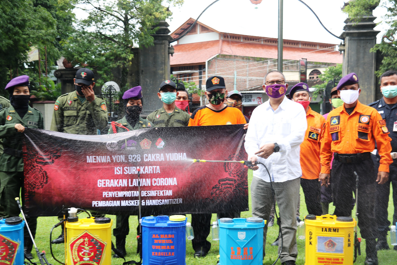 Resimen Mahasiswa Yon.928 Cakra Yudha Institut Seni Indonesia Surakarta bersama IGANA Jawa Tengah, MENWA Se-Surakarta dan sivitas akademika melaksanakan kegiatan penyemprotan cairan disinfektan, pembagian masker dan pembagian handsanitizer di lingkungan Kampus I Institut Seni Indonesia Surakarta, Rabu (3/2/2021).