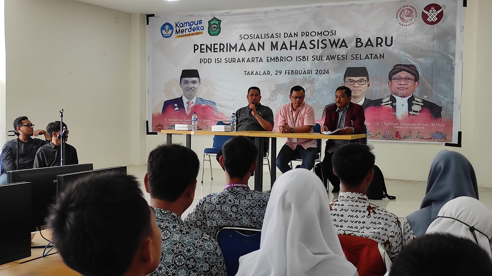 HUMASISISOLO— Dalam rangka Seleksi Penerimaan Mahasiswa Baru Tahun 2024, Program Studi di Luar Kampus Utama (PSDKU) Institut Seni Indonesia Surakarta (ISI Solo) Embrio ISBI Sulawesi Selatan Kampus Takalar menyelenggarakan kegiatan Sosialisasi dan Promosi (Sospro) SPMB di Gedung Perpustakaan Daerah Kabupaten Takalar, Kamis (29/2).